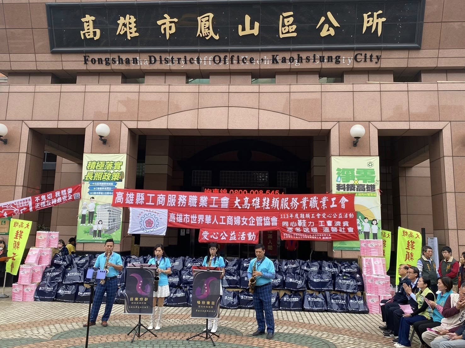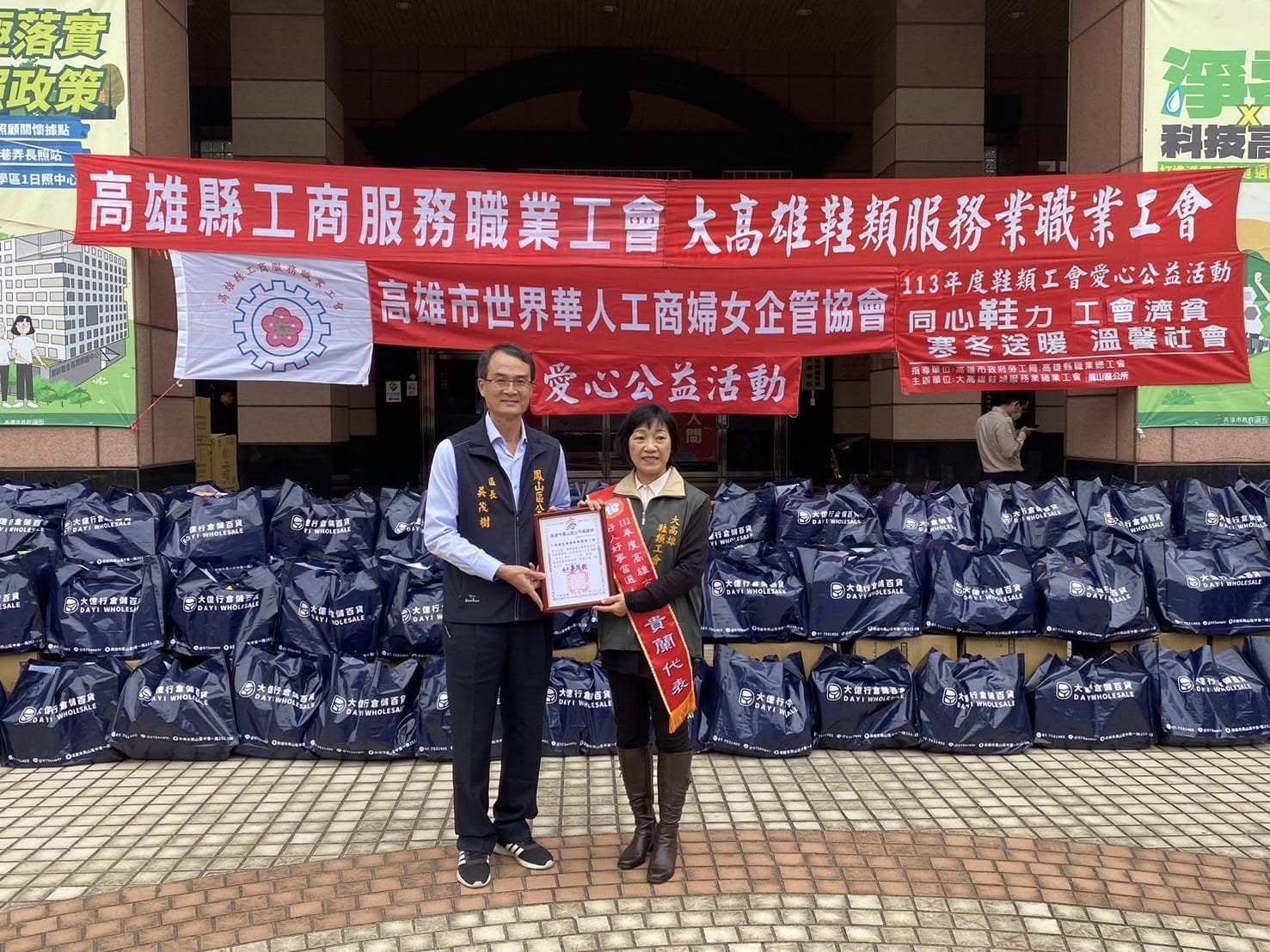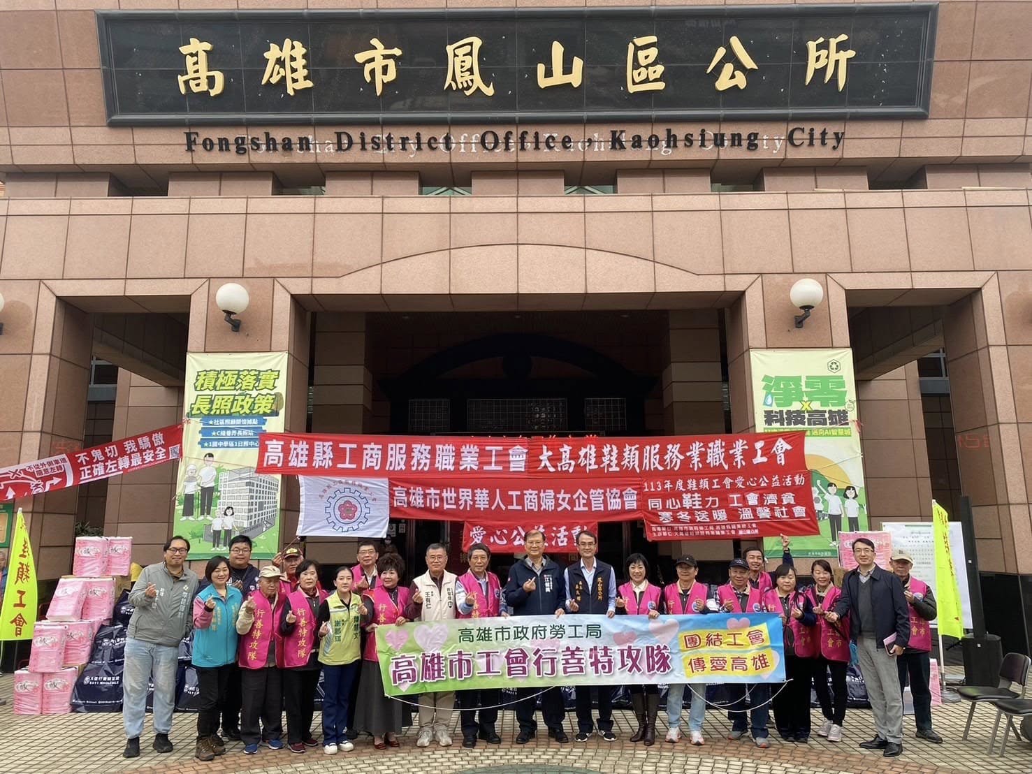 歲末年終,大高雄鞋類服務業職業工會、高雄縣工商服務職業工會及高雄市世界華人工商婦女企管協會今日(12/27日)下午在本所廣場辦理愛心公益活動,贊助鳳山區弱勢家戶民生物資,活動現場邀請唐心幸福庇護工廠、嗓欣樂目樂團及舞采繽紛舞團帶來精彩的表演。鳳山區長吳茂樹表示:非常感謝勞工局江局長、工會理事長、幹部及會員們,長期關懷社會弱勢,散播社會正能量。