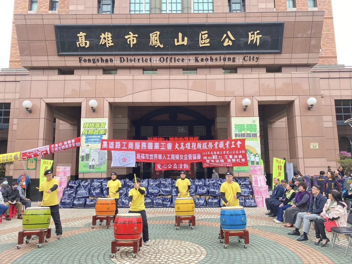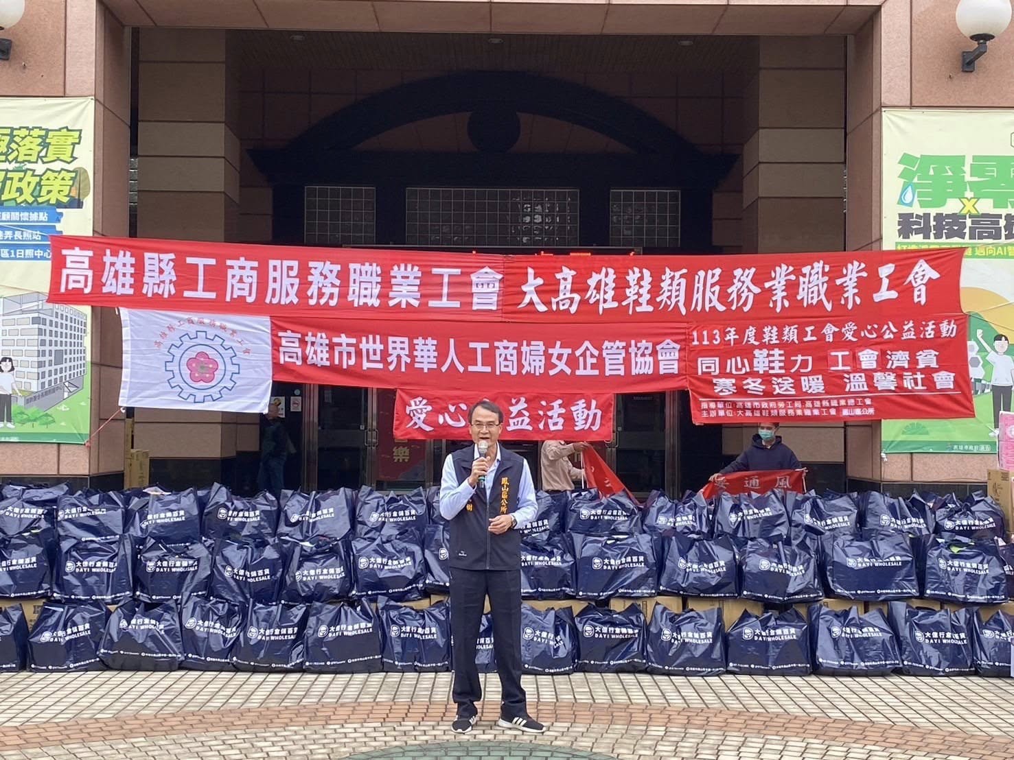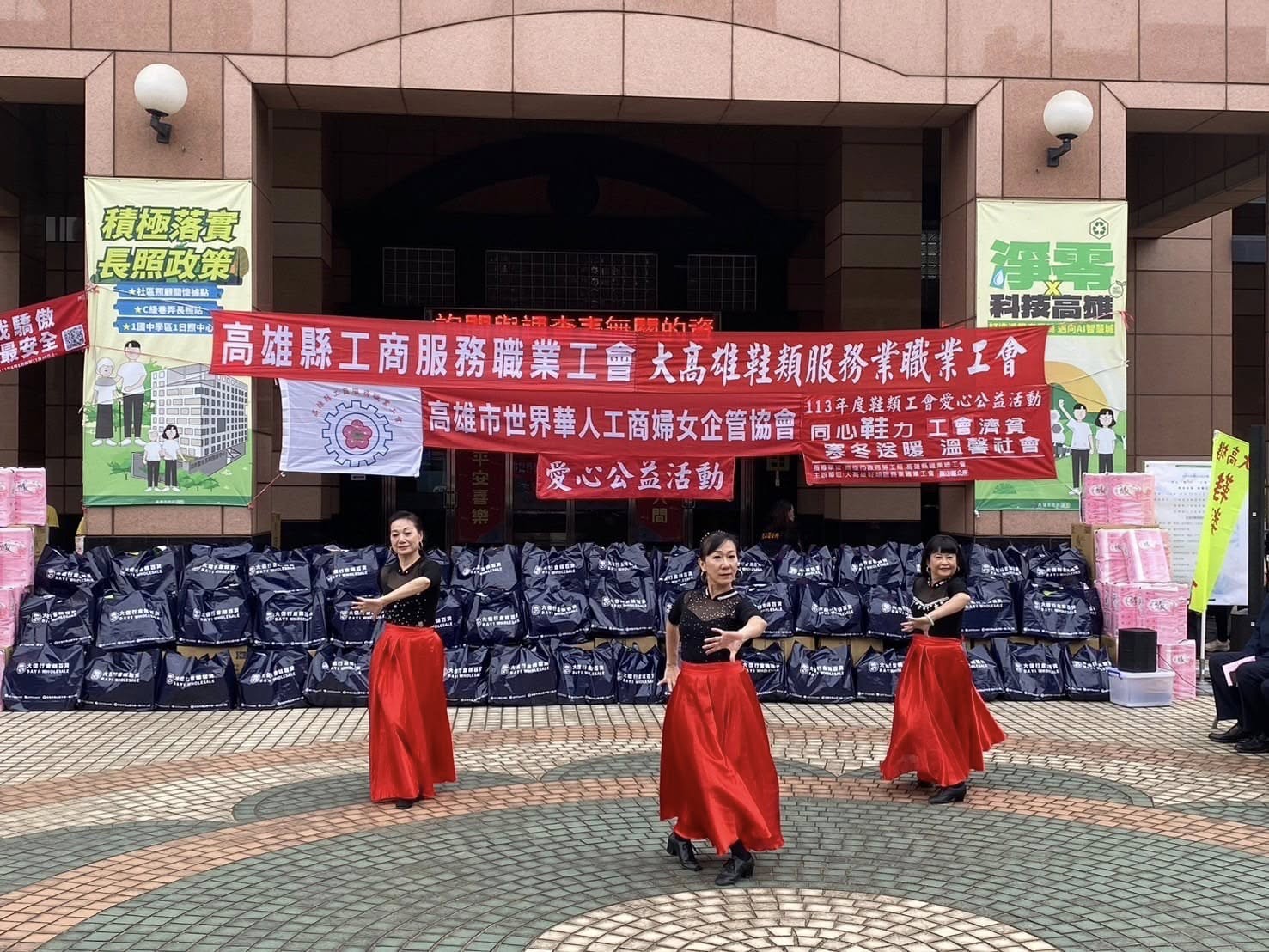 歲末年終,大高雄鞋類服務業職業工會、高雄縣工商服務職業工會及高雄市世界華人工商婦女企管協會今日(12/27日)下午在本所廣場辦理愛心公益活動,贊助鳳山區弱勢家戶民生物資,活動現場邀請唐心幸福庇護工廠、嗓欣樂目樂團及舞采繽紛舞團帶來精彩的表演。鳳山區長吳茂樹表示:非常感謝勞工局江局長、工會理事長、幹部及會員們,長期關懷社會弱勢,散播社會正能量。